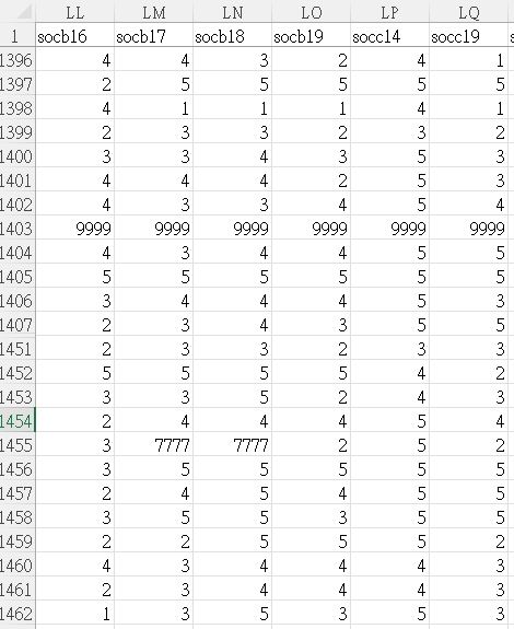 以下呈現的是資料在Excel開啟後的部分截圖。對照第一段的特殊編碼說明,可以看出:在一片1、2、3、4、5的soc變項(社會情緒問卷)資料中,第1403列有多筆遺漏作答(9999),第1455列有2筆拒答(7777)。