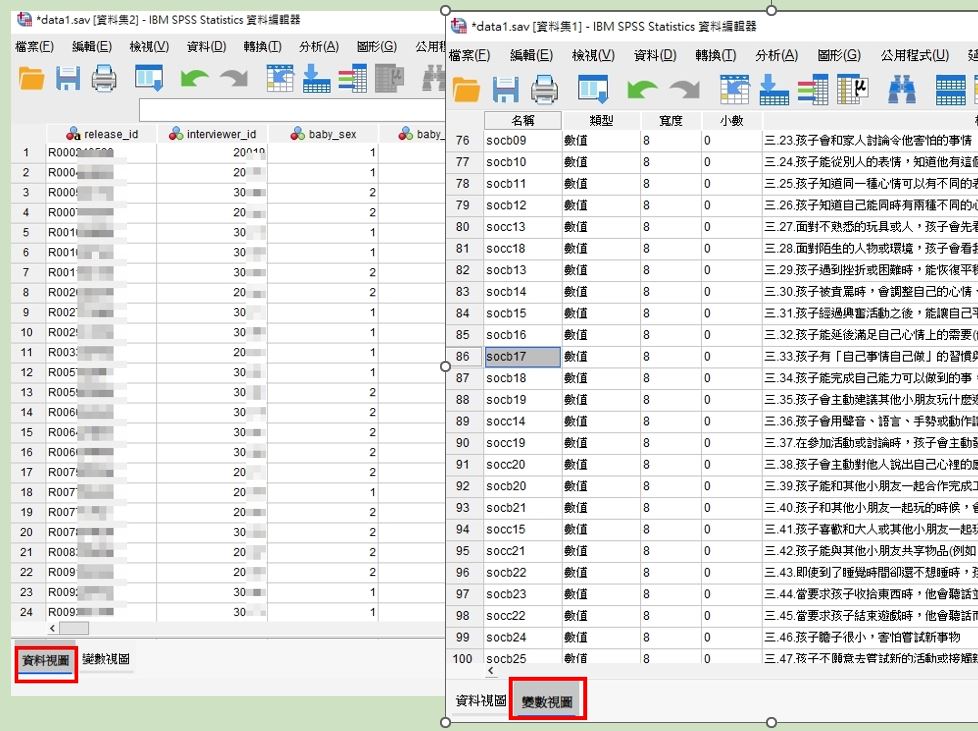 SPSS打開後,有兩個工作頁,左側是【資料視圖】,右側是【變數視圖】。請至右邊的【變數視圖】:
