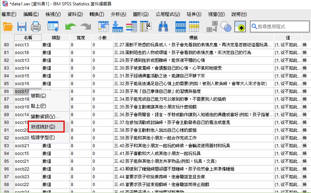選擇單一或數個變項(利用Shift鍵多選反白),按右鍵,點選「敘述統計」: