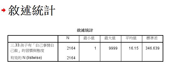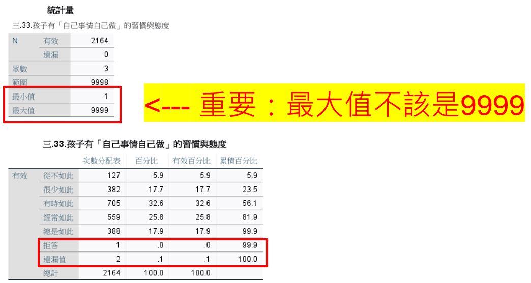 以36月齡組第一波的家長資料(data1)為例。輸出頁面中出現敘述統計的資訊,我們發現,社會情緒問卷填答選項中最小值至最大值應為1-5,但最大值在未處理狀態下是9999。其次,在下方的次數分配表中也可見,在2,164筆資料中,有1筆拒答、2筆未答: