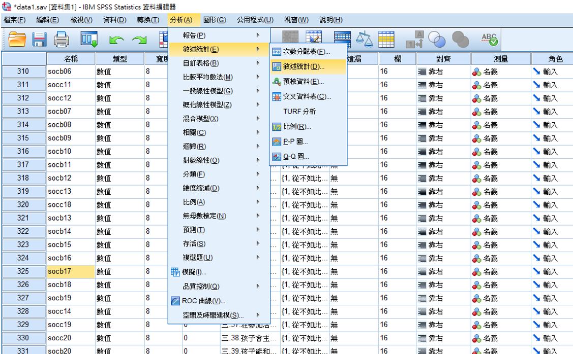 此外,也可以在SPSS功能中選擇【分析】-->【敘述統計】-->【敘述統計】,在清單中找到該變項,並按【確定】: