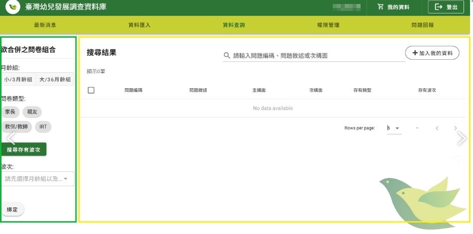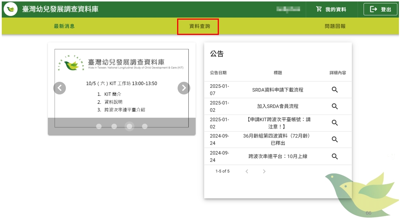 1. 登入KIT跨波次平臺頁面(https://kitwaves.hdfs.ntnu.edu.tw/):上方橫欄指令有三個,請選擇「資料查詢」(如下圖):