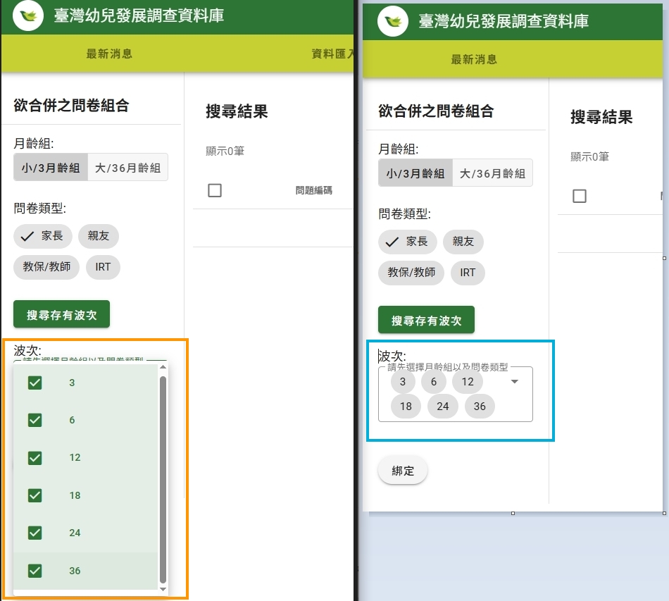 (4) 波次(選擇月齡,例如【3、6、12、18、24、36】)(左下橘框為選擇畫面、右下藍框為選擇完成畫面)