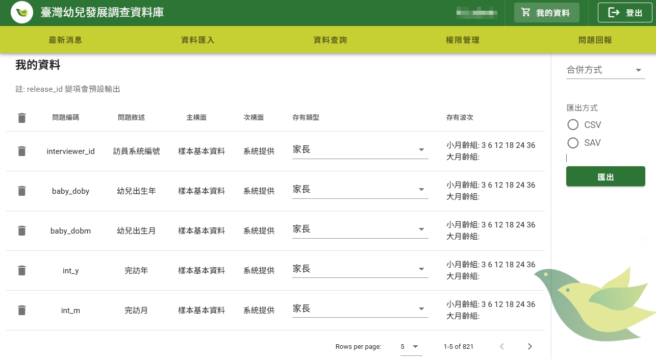 (2) 選擇【匯出方式】:可選擇SPSS的.sav格式。另外提供原始資料檔的.csv格式(可以Excel開啟,該檔案中的第二個工作頁即為SPSS檔案中的變數視圖)