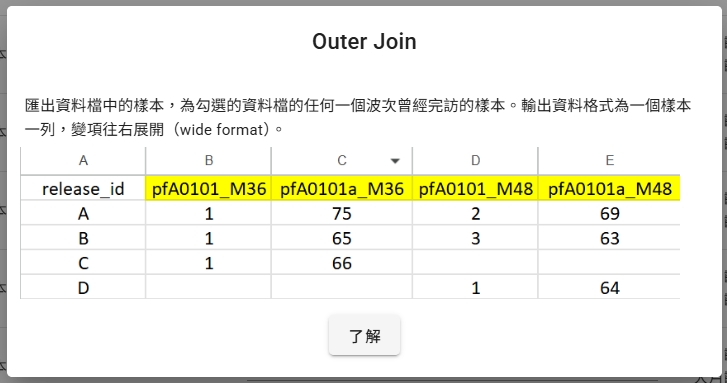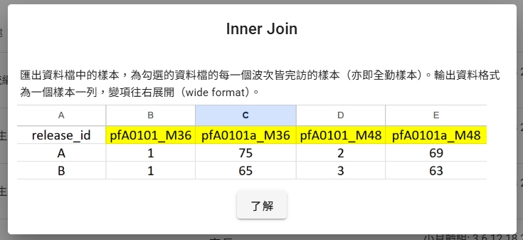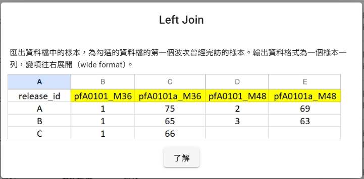 (4) Left Join(選擇的多個波次中第一個波次完訪的樣本):例如選擇了3、6、12、18四個波次,這個輸出格式則會以3月齡資料完訪的樣本為主。輸出格式同Inner Join、Outer Join,為寬格式(wide format)。一個樣本僅有一列,所有變項往右展開。若選擇此項合併方式,系統會要求選擇基準波次。
