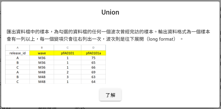 (3) Union(任一波次曾完訪的樣本,縱貫資料):樣本同Outer Join,為任何一個波次曾經完訪資料的樣本。輸出格式為四種合併方式中唯一的長格式(long format),適用於縱貫資料分析。一個樣本會超過一列,每個變項只會往右列出一次,波次往下展開。