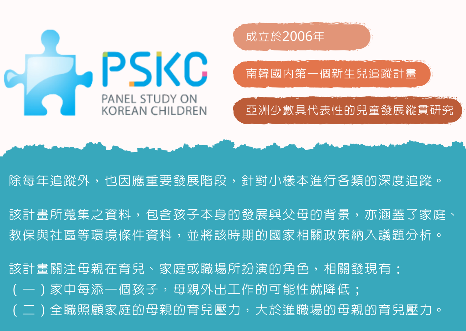 這一期電子報為您介紹的是南韓兒童縱貫研究計畫Panel Study on Korean Children(PSKC,한국아동패널),PSKC與KIT計畫相同,都是亞洲少見的兒童發展長期追蹤計畫。PSKC計畫成立於2006年,為南韓國內第一個新生兒追蹤計畫,由國家級研究單位Korea Institute of Child Care and Education(KICCE)執行。該計畫以南韓國內(排除離島)在2006年間新生兒人數至少達500名的醫療院所做為第一層的抽樣對象,排除不會說韓語、18歲或以下、產後健康狀況極差、重大傷病的母親,以及重大傷病、多胞胎或待領養的新生兒,然後抽出2,562戶參與先期計畫的家庭,其中有2,150戶成為該計畫的樣本家庭。該計畫預計追蹤至2027年(樣本滿19歲),並將啟動另一個新的兒童發展縱貫期計畫,以掌握當前世代兒童發展和環境的樣貌。