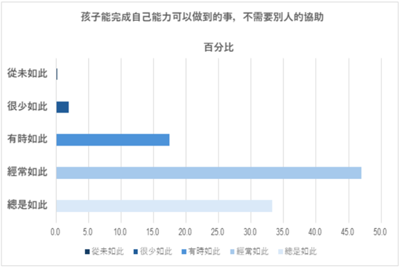 有80%的孩子「經常」或「總是」 能獨立完成力所能及的事情,顯示多數孩子具備良好的行動力與自信。