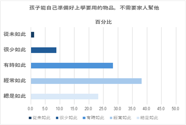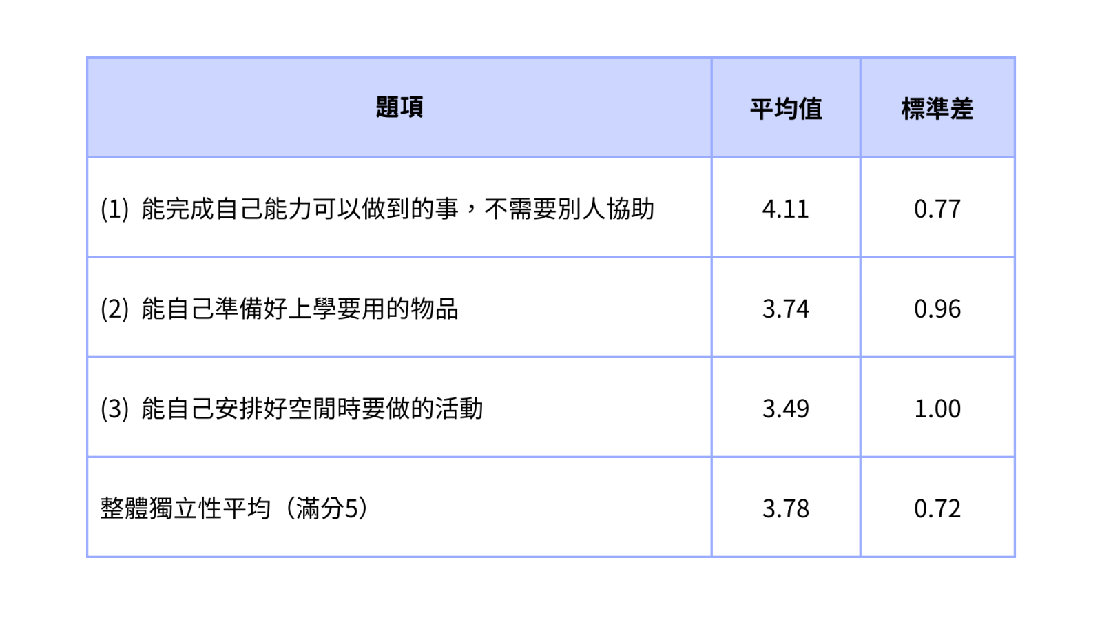 在(1)自己完成力所能及的事、(2)自己準備上學用品、(3)自己安排空閒時間的活動這三項指標中,平均分數皆落在3.5分以上(滿分5分),代表孩子大多處於「經常能做到」的程度。