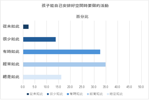 與前兩項相比,孩子在「安排活動」上的能力較弱,僅約51%能經常或總是自行安排。顯示他們在時間規劃與自主決策能力上仍有進步空間。