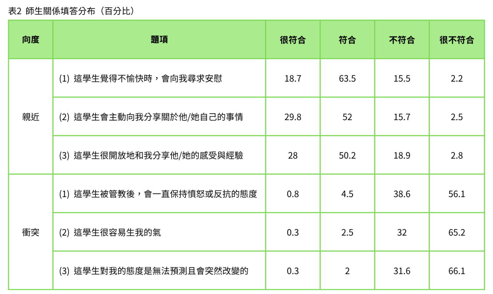 從表1可以看出,親近關係的平均分數落在中等偏高,而衝突相關分數則明顯偏低,顯示多數孩子與老師之間的互動整體偏向正向且穩定。若進一步由表2來看師生關係的細項填答分佈,可以更清楚看見孩子與老師互動的樣貌: