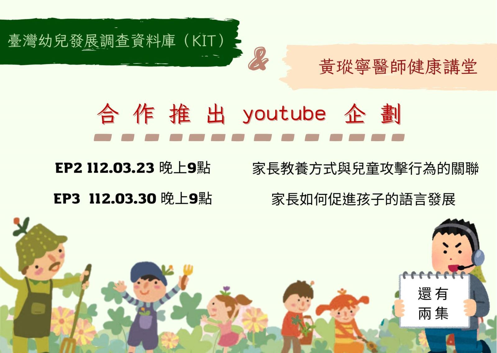 臺灣幼兒發展調查資料庫(KIT)與黃瑽寧醫師健康講堂合作之系列影片第二集、第三集即將上映,歡迎大家準時收看喔!