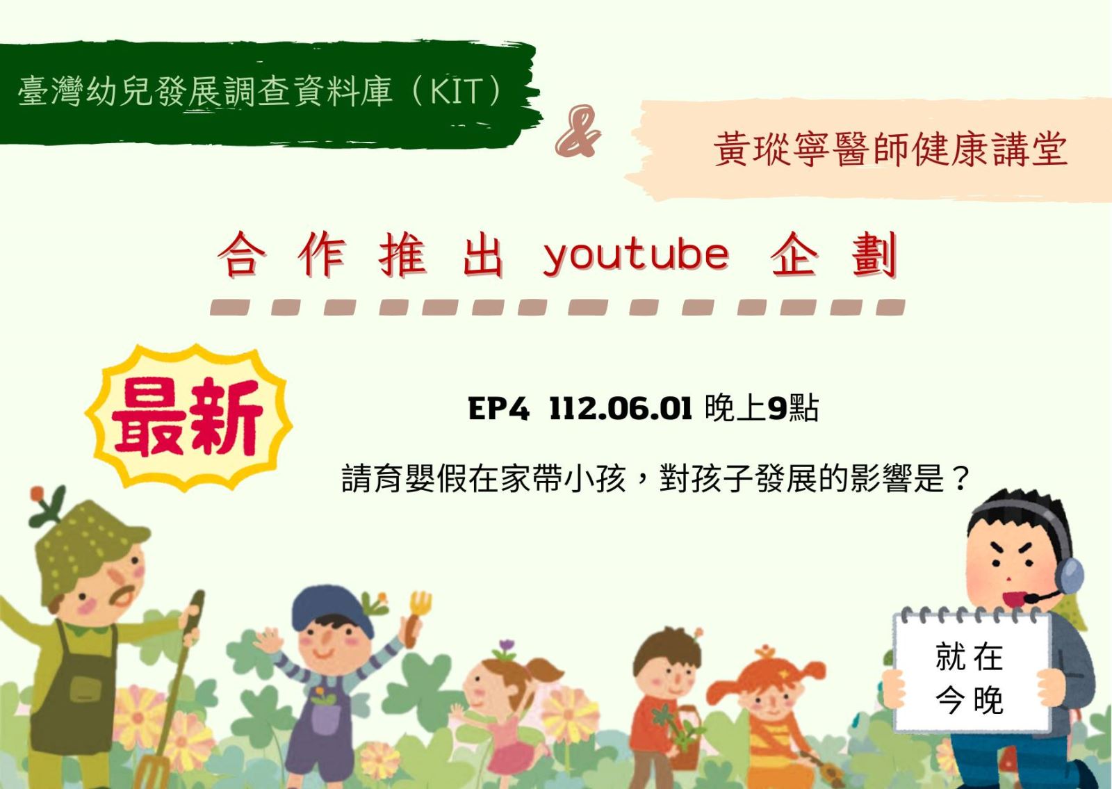 臺灣幼兒發展調查資料庫(KIT)與黃瑽寧醫師健康講堂合作之系列影片第四集即將上映,歡迎大家準時收看喔!