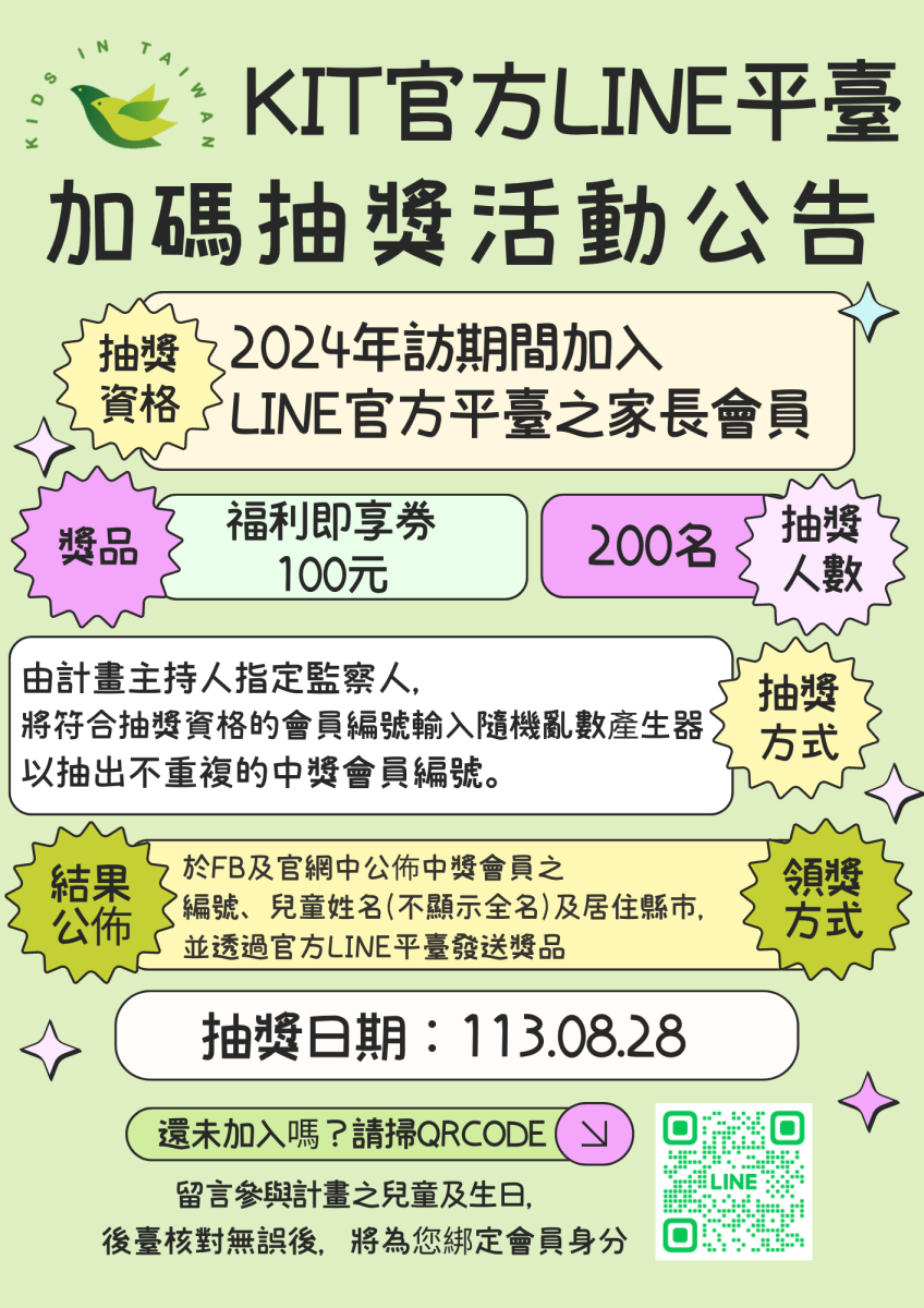 The bonus KIT LINE Lucky Draw event is coming up on Wednesday, August 28! Parent members who joined our LINE platform during the current survey period are eligible to participate. If you haven’t, be sure to sign up in time to take part in the event!